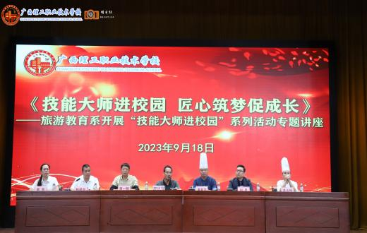 活动中,潘英学从“烹饪学生专业职业人生规划”、“烹饪专业人才要求”、“如何学好烹饪技能”三个方面向广西理工职业技术学院烹饪专业学生进行讲解,围绕“竞赛技术文件解读”、“竞赛流程讲解”、“竞赛集训流程”以及“竞赛作品分享”等四个方面分享了技能大赛规程及备赛心得。潘英学还现场亲自为全体师生示范操作国赛“脆皮百花鸡”、“鱼蓉龙爪菊”、“像生天鹅蜂巢虾”、“像生鱼蓉麦穗玉米”四个作品并进行讲解,与现场师生交流互动。