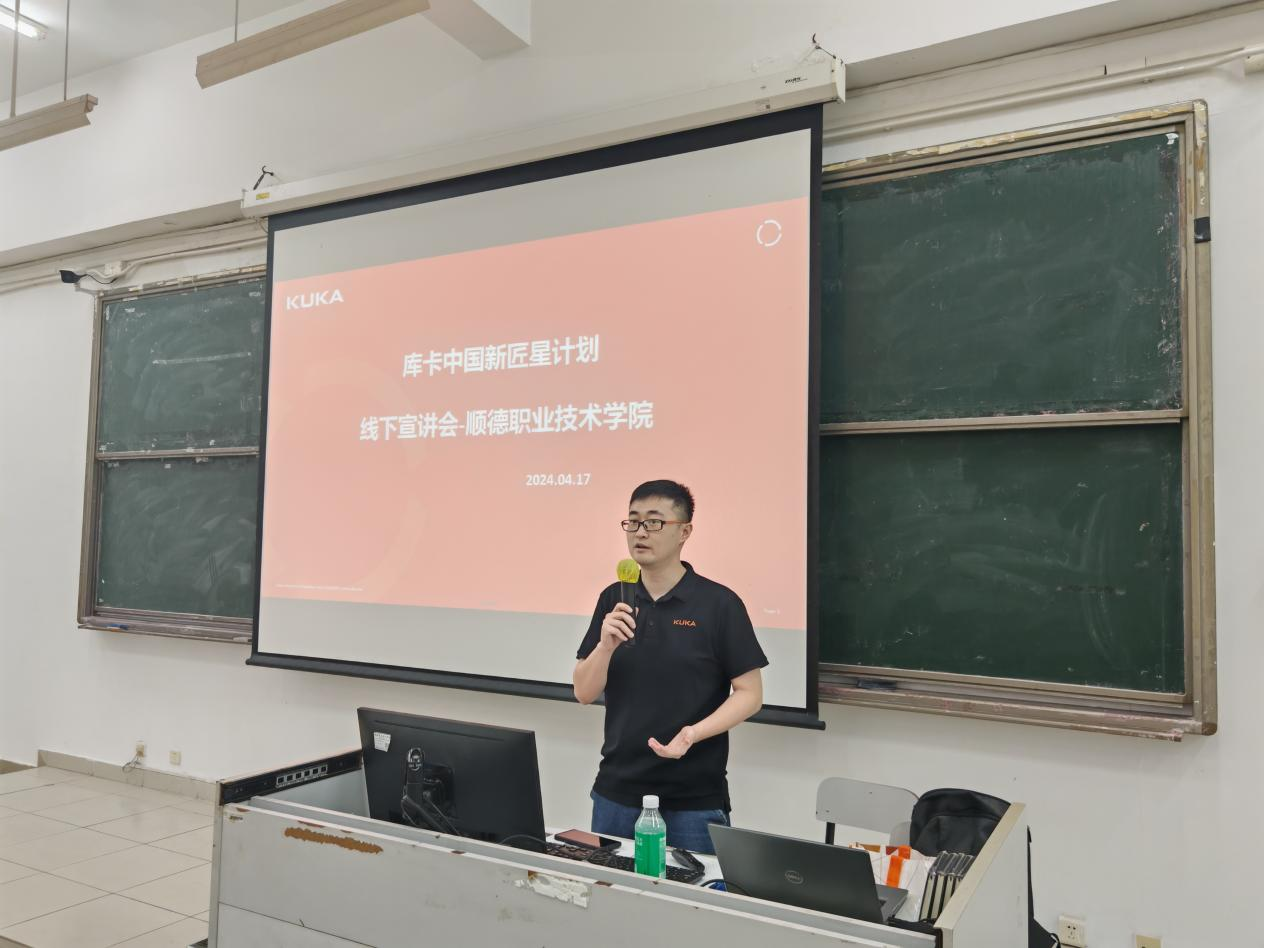 4月17日,智能制造学院与库卡机器人(广东)有限公司(以下简称“库卡中国”)在学校教学楼联合开启“2024新匠星计划”,旨在深化产城教融合办学特色,通过紧密的校企合作与独特的双元制培养体系,为高职学生打造一条直通机器人行业高端技术技能岗位的成长通道。200余名师生和库卡公司人员参加宣讲会。
