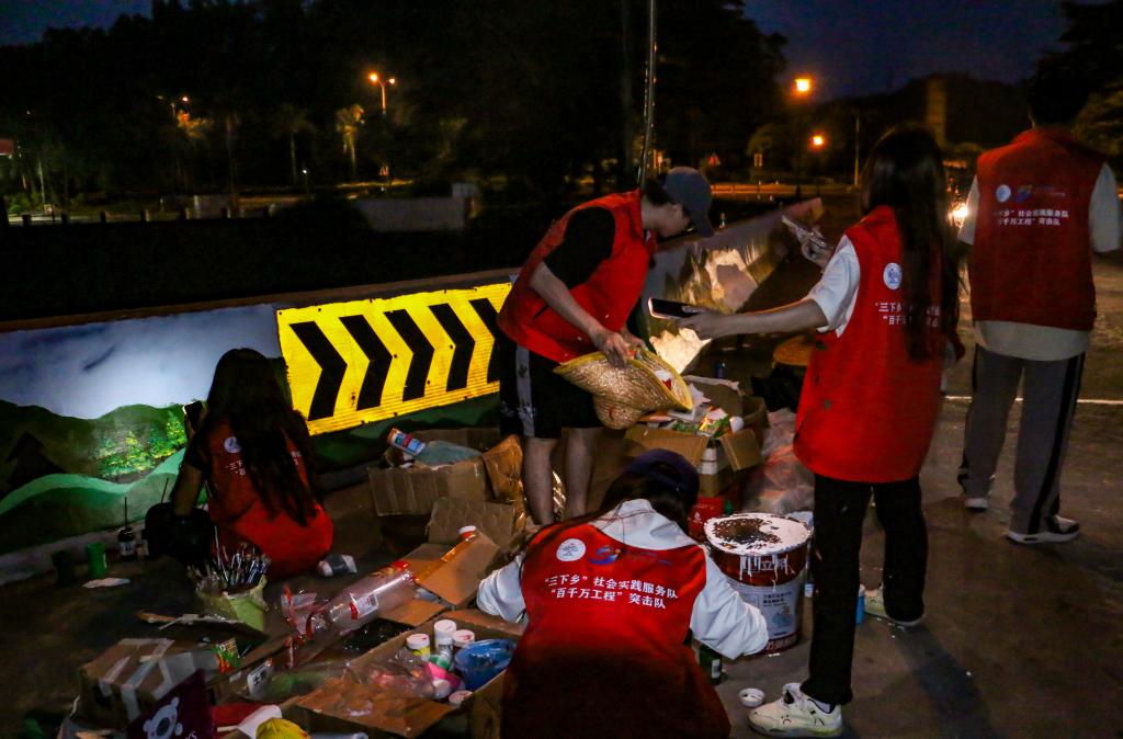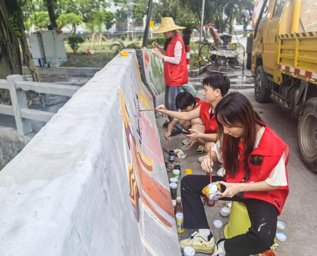 本次墙绘选址分别跨越杨梅河、沙水河进入杨和镇装备制造产业园的两座主要桥梁。突击队队员们在对装备制造产业园的走访调研基础上,围绕 “百千万工程”和“绿水青山就是金山银山”等主题,紧密联系高明区杨和镇装备制造产业园发展实际,设计出“绿水青山”、“生态环保”、“鱼跃龙门”等美丽山水与工业园区共融的墙绘画卷。他们分工合作,先使用粉笔在桥面上勾勒出清晰的轮廓,接着调配颜料色彩,将画面涂抹均匀,原本单调的桥面墙壁经描绘后变得立体且富有层次,焕发出勃勃生机。活动历时两天两夜,共完成了全长超250米,面积达300平方米的三个主题墙绘。
