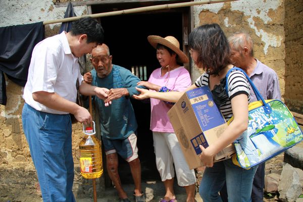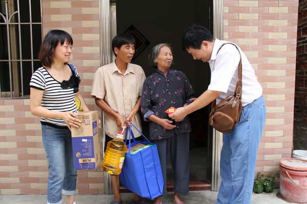 烈日炎炎,村路泥泞崎岖,在两个部门党支部书记的带领下,包括退休党员在内的15名党员志愿者,深入到英德市九龙镇石角村的塘埪、木洞等九个村小组看望“亲戚”们。他们共走访慰问了贫困户、五保户等对口帮扶对象十四户。党员们与帮扶对象进行了深入的交谈,并向他们送上慰问品、慰问金。每到一户人家,工会、财务处党支部书记和其他同志都亲切地握着帮扶对象的手,关切地询问帮扶对象的生活、生产情况。当他们了解到贫困户曾红全等家庭在德赢和乡村的帮助下,已经初步脱贫,今年在扩大生产、外出打工等方面会继续努力时,表示祝贺。他们热情鼓励其他“亲戚们”自立自强,通过勤劳致富,走出生活困境。曾红全对工会党支部书记专门托人带来胃药给他母亲治病感谢。