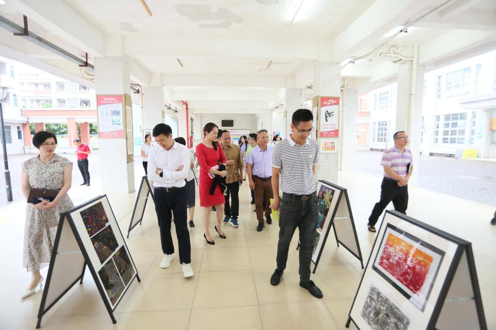 由于天气原因,美育浸润行动计划成果展演延期。当天,与会人员共同参观了美育浸润绘画书法成果长廊。