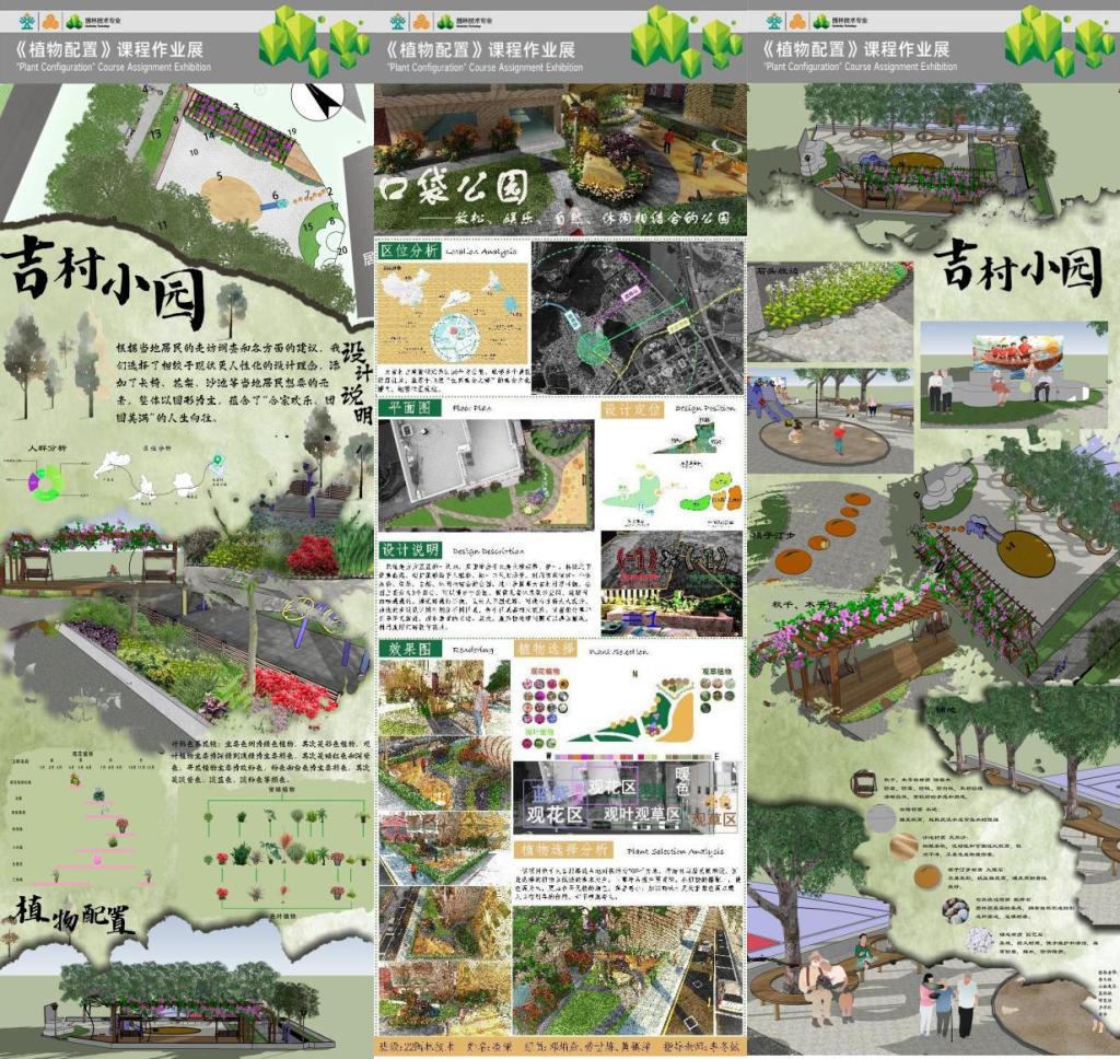 在李冬妹教授的指导下,实践团结合《植物配置》课程内容,完成了十套设计方案,构思新颖,亮点突出,各具特色,比如根据大吉村名延伸出“吉圆小苑”主题,赋予群众和谐、团结的寓意,设计包含全龄玩乐元素,实现口袋公园美观实用的休闲功能,对苏岗社区下一阶段优化提升具有实践参考价值。