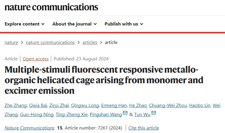 近日,轻化与材料学院龙庆武博士与广州大学合作的研究成果发表在极具影响力的综合性期刊《Nature Communications》上,该期刊在2023年的影响因子为14.7,为中科院一区期刊。发表的研究论文题为“Multiple-stimuli fluorescent responsive metallo-organic helicated cage arising from monomer and excimer emission”,德赢作为论文的第一合作单位,在此研究中发挥了较为重要作用。该研究得到了国家自然科学基金等项目的支持。