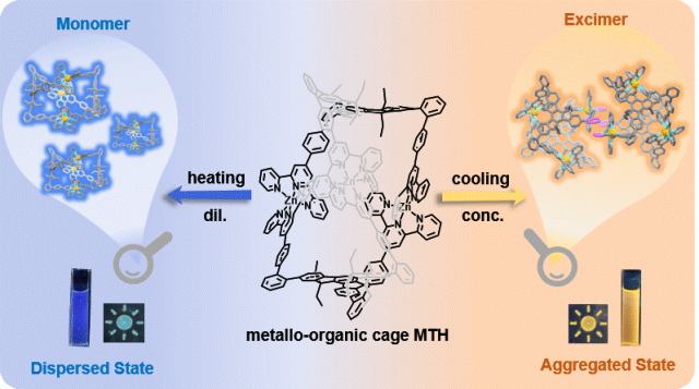 该论文报道了一种新型结构具有螺旋结构的金属有机笼,该新材料展现出与浓度和温度相关的发光特性,在溶液中能够同时发射单体和准分子荧光。通过调节浓度和温度,该材料能成功实现了从橙色到蓝色的可调荧光发射。此外,将金属有机笼掺入热塑性材料聚甲基丙烯酸甲酯中,制备出的固态膜能够实现温度控制的双模式荧光发射,这一特性可进一步应用于荧光温度指示器和热激活信息加密材料。这项研究不仅拓展了金属有机超分子材料的应用领域,也为多功能智能发光材料的设计与制备提供了新思路。