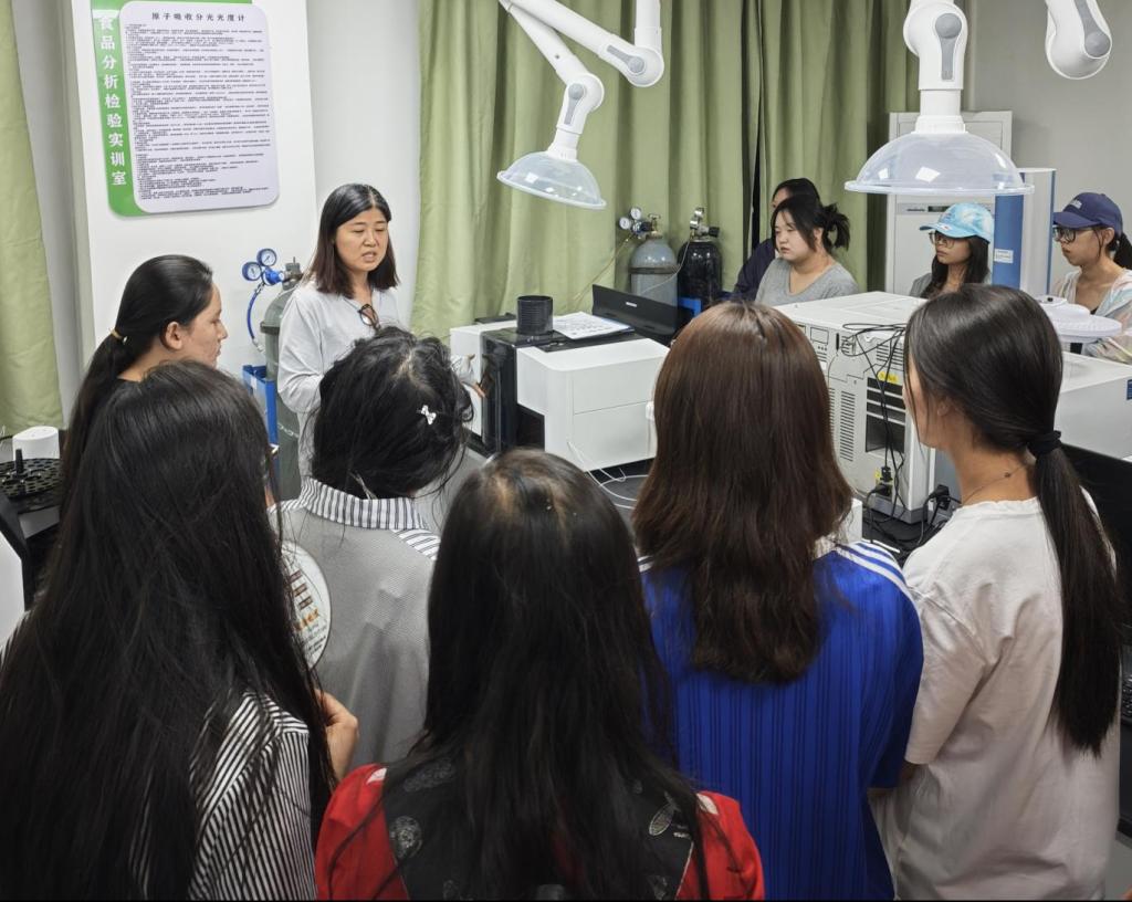 活动期间,老师们带领学生实地参观了食品理化实验室、精密仪器分析室和食品加工实验室。彭莺针对色谱、光谱、质谱等大型精密仪器,详细讲解其原理和安全注意事项,让学生们对这些精密仪器有了初步直观认识。唐秋实着重介绍了质构仪、凯氏定氮仪、索氏抽提仪等食品理化分析设备的工作原理、应用场景和安全事项。