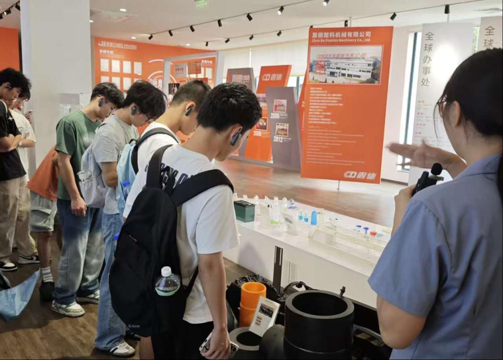 研学团队的第二站转赴震德塑料机械有限公司。作为全球注塑机械行业的头部企业,震德的“绿色制造”理念让学生们印象深刻。“我们的设备通过优化液压系统和能量回收技术,能耗比行业平均水平低25%。”在震德的产品展厅,震德的技术专家指着一台新型节能注塑机介绍。随后,学生们走进精密加工车间,观察工人如何通过精密测量仪器调试模具精度。“以前觉得‘精密制造’离我们很远,今天看到师傅们用0.02毫米的游标卡尺反复校准,才明白‘工匠精神’就藏在每一个细节里。”新能源装备技术专业的学生卢宝宜感慨道。
