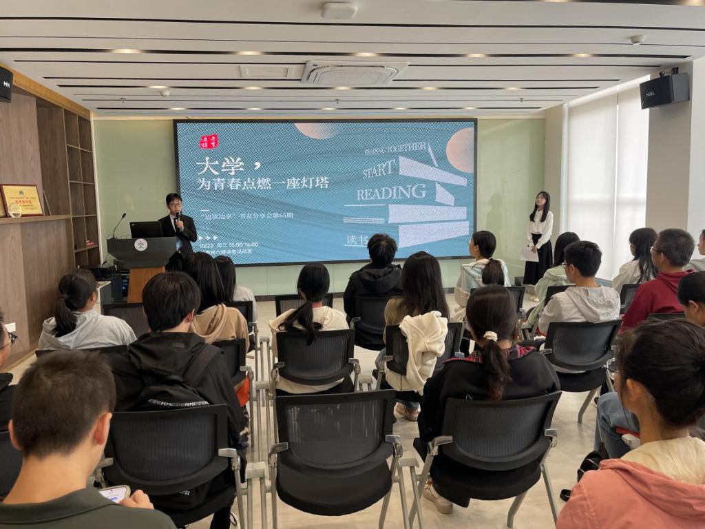 10月22日下午,图书馆在六楼活动室举办第65期“边读边享”书友分享会。本次活动以“大学,为青春点燃一座灯塔”为主题,邀请轻化与材料学院林道聪、智能制造学院陈丹娜两位优秀学生代表分享经验,吸引了众多新生参与。