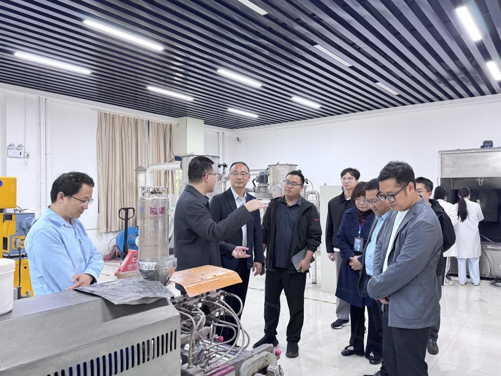 代表团实地考察了轻化与材料学院实训中心,并详细了解了实训中心仪器设备的配置情况、实践教学运行模式以及近年来取得的代表性科研成果。