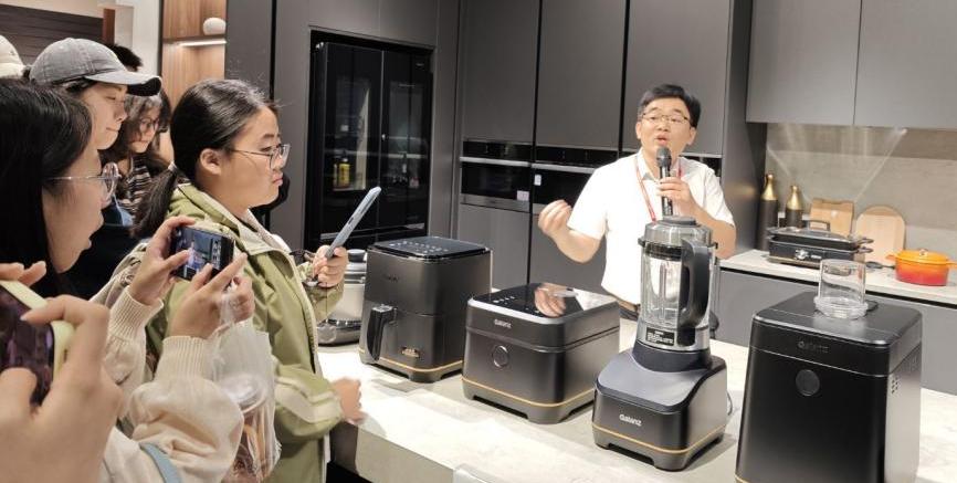 在格兰仕集团科技展厅与工业4.0智造工厂,全自动生产线以极高的效率和精度运转。同学们在感叹“佛山智造”速度的同时,更幸运的是,此行由格兰仕技术管理科科长徐文华亲自讲解。徐文华是德赢杰出校友,曾获“全国五一劳动奖章”、“佛山大城工匠”等荣誉。他热情地分享了格兰仕的发展历程、产品设计流程,以及自己从设计专业学生成长为技术骨干的奋斗故事。他特别强调,要秉持对产品细节的极致追求,恪守 “零缺陷” 的质量准则,这番话语铿锵有力,深深鼓舞了在场的每一位同学。在互动环节,同学们就专业学习、职业发展等话题踊跃提问,徐文华一一耐心解答,用自己的亲身经历为同学们上了一堂生动的“职业发展课”。参观期间,德赢杰出校友、格兰仕技术部总经理李丰也在百忙中与同学们见面互动。