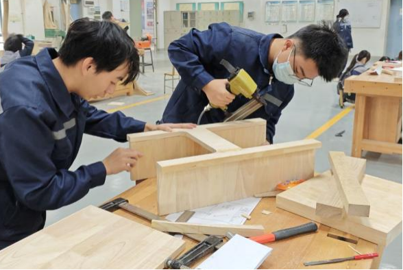 建模完成后,家具工艺班的师兄师姐接力辅导,指导同学们将数字模型转化为可落地的工艺文件。随后,在实木家具实训室,同学们亲手经历了备料、开料、打磨、涂装等完整工序,将一块块木板变成了精美的灯柜。