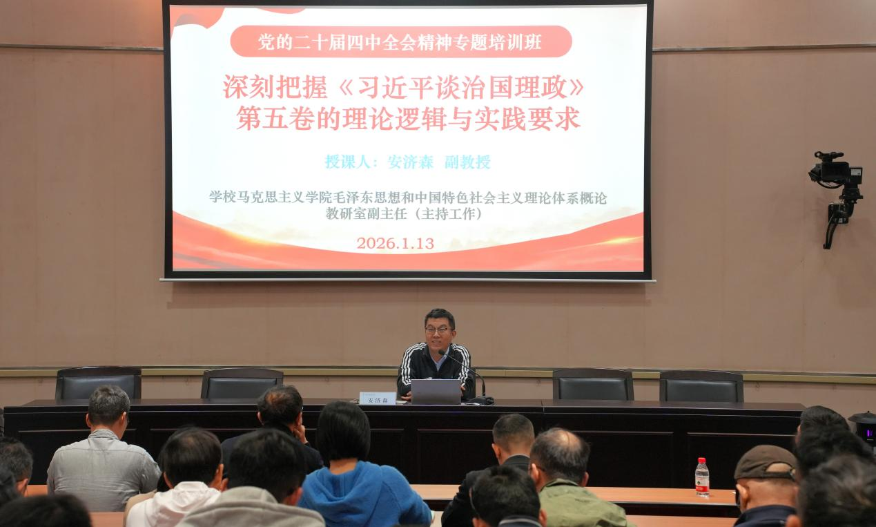 学校马克思主义学院毛泽东思想和中国特色社会主义理论体系概论教研室副主任(主持工作)安济森副教授,以“深刻把握《习近平谈治国理政》第五卷的理论逻辑与实践要求”为题开展专题授课,从理论深度与实践维度出发,系统解读了《习近平谈治国理政》第五卷的核心要义与精神实质,为参会人员准确把握著作的思想精髓、提升理论素养提供了有力指导。
