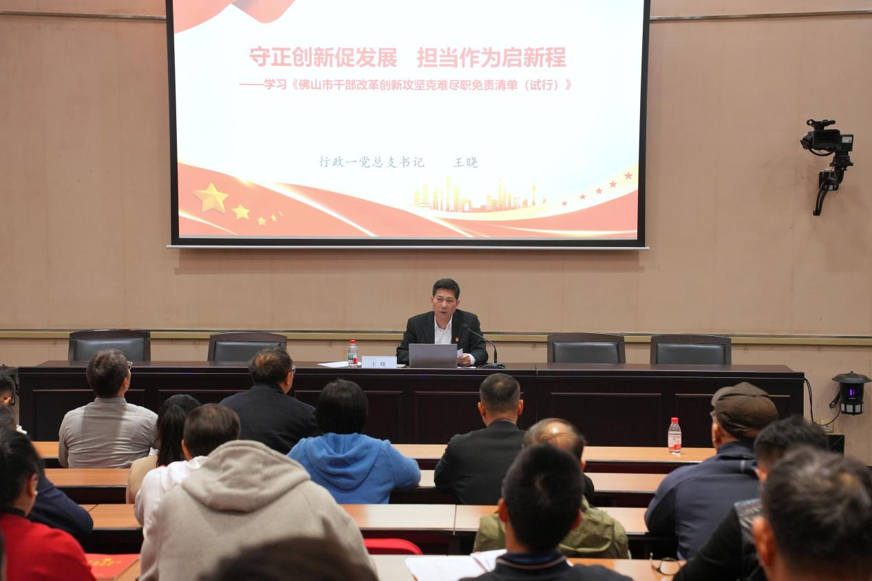 会议最后,王晓以“守正创新促发展 担当作为启新程——学习《佛山市干部改革创新攻坚克难尽职免责清单(试行)》”为题开展专题党课,结合党总支工作实际和干部队伍建设需求,对清单内容进行了细致解读,鼓励全体党员干部在工作中既要坚守初心使命、严守纪律底线,又要勇于改革创新、敢于攻坚克难,以担当作为的精神状态推动各项工作再上新台阶。