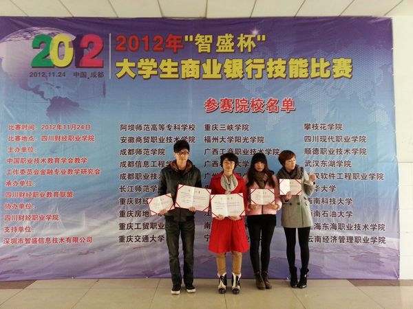 2012年“智盛杯”大学生商业银行技能大赛”由中国职业技术教育学会教学工作委员会金融专业教学研究会主办、四川财经职业教育联盟承办,有来自全国共30所本专科高等院校近百名选手参加此次大赛。此次大赛依据高等职业教育金融专业教学资源库项目课程标准,使用“智盛银行综合业务技能竞赛平台”软件作为“业务技能”竞赛处理工具,以商业银行综合业务柜员角色处理各种银行柜台业务。经过一个多月的精心准备,同学们在比赛中沉着冷静、快速反应,终获佳绩。