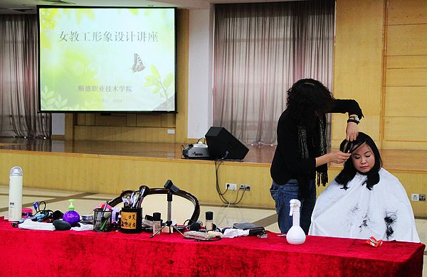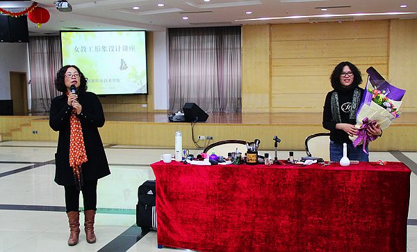 杨麒麟女士,是著名的形象设计师。十年来,先后担任过北京国际时装周、广州车展、广州亚运会、澳门车赛等大型活动的指定化妆师。她详细地讲解了化妆步骤,教女教工如何正确的使用化妆品,并随机邀请了一位老师,作为模特,进行着妆及发型设计,让大家亲身体验化妆带来的不同效果。