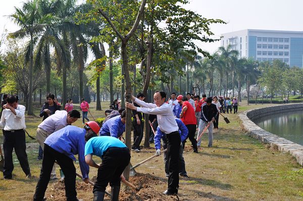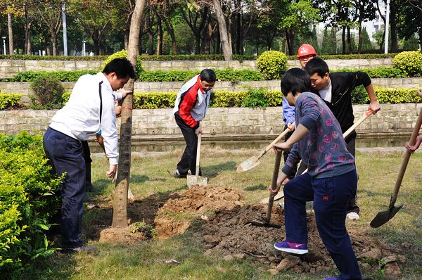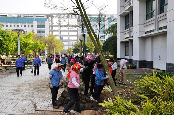 为迎接第35个全民义务植树节和三八妇女节的到来,3月8日上午,总务处党支部和工会小组联合组织开展“义务植树,绿化校园”活动,学校陈粟宋副校长,总务处党支部全体党员和女职工共50人参加了此次活动。