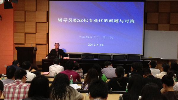 4月16日下午,华南师范大学思政部主任陈岸涛教授在5号学术报告厅为各院系书记、全体辅导员、学生处全体成员共50余人作了题为《辅导员职业化专业化的问题与对策》的专题讲座。陈教授的讲座生动活泼、妙语连珠,谈笑风生中让在场的各位明白了辅导员工作“是什么”的问题,应该如何把握辅导员三位一体的岗位性质,辅导员工作“为什么”要走职业化、专业化道路的问题及“ 怎么样”走好这条道路的问题,他强调要在工作中学会养成良好的解决问题的思维习惯。陈教授的讲座引发了在场每一位学生工作者的深思。辅导员们纷纷表示此次讲座让大家收获颇丰,明确了今后要走的道路,激发了大家前进的动力