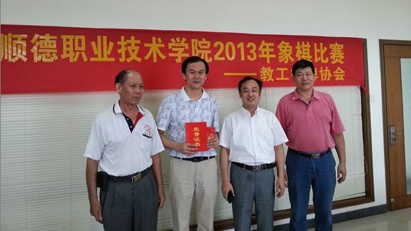 近日,学校工会和学校教职工棋牌协会在“教工之家”举办了“2013年教职工象棋比赛”,学校象棋爱好者20余人参加了本次比赛。棋牌协会同时举行了2013年年会,选举谢金生为新任会长,李亚军为副会长兼秘书长,袁雪平为副秘书长。授予齐振彪荣誉会长。而新任会长旗开得胜夺得比赛冠军,成为一段佳话。顺德象棋协会副会长孔广学,德赢工会、经管学院负责人出席了活动,并为获奖者颁奖。