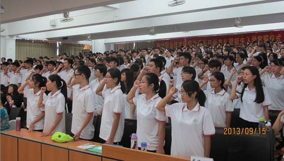 全体2013级新生则做出了庄严地宣誓:承诺将自觉遵守《高等学校学生行为准则》,努力使自己成为祖国满意、人民满意、父母满意的合格大学生。
