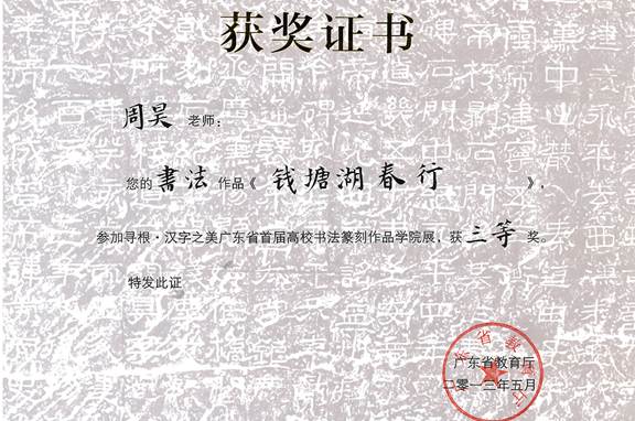 由广东省教育厅主办,广东省教科文卫工会、广东省学生体育艺术联合会、广东省学校艺术教育指导委员会承办,广州美术学院、广东省高校美术与设计教育专业委员会协办的“寻根·汉字之美——广东省首届高校书法篆刻作品展”获奖作品评选工作已经结束,德赢周昊老师书法作品----隶书条屏《钱塘湖春行》荣获教师组三等奖。