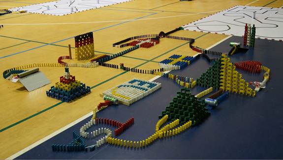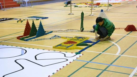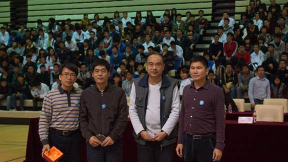 在总决赛前,校团委、电信学院相关负责人,指导老师及全体辅导员都到现场进行指导,给了大赛莫大的支持和鼓励。在总决赛现场,气氛活跃,掌声不断,观众都为参赛队员的技能和创意欢呼呐喊。智能小车考验了学生单片机技术和编程能力,多米诺骨牌则考验了学生的创意和团队精神。各参赛队摆出形态各异,充满创意的骨牌造型,折服了全场观众,赢得一轮又一轮的惊叹和掌声!为增加此次大赛的科技含量、创新性、视觉感官性,特别邀请了佛山蓝飞翔电子实业有限公司及顺峰山航模乐园带来了精彩的飞行器表演,飞行器以高空360度旋转航拍,低空螺旋上升探月,演绎了一场华丽的飞行表演,赢得在场观众的阵阵惊呼和热烈掌声。最后来自电信学院domino荣获一等奖和最佳创意奖,机电工程学院小米队、电信学院蜗牛队荣获二等奖,外语学院Super. Machine队、人文社科学院红中一点蓝队、电信学院TSA队荣获三等奖。