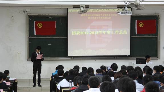 大会在主持人致贺词中拉开了序幕。首先,电信学院团委相关同学对2012—2013学年工作作了总结报告;随后,团学干部进行了换届竞选演说。本次竞选共有9位学生竞选团委副书记和学生会主席职位,他们分别就个人基本情况、竞岗优势、目标与措施进行了阐述,争先展现自己的风采和才干。最后,为退任的学生干部颁发了聘书和有电信学院特色的学生干部纪念牌。