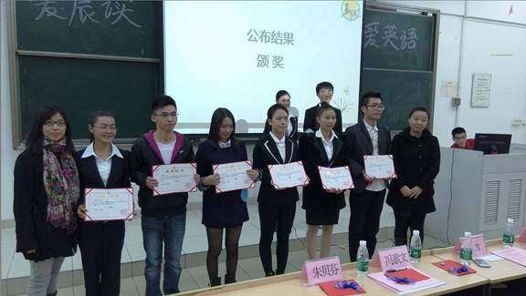 在历时2小时的比赛中,现场气氛热烈,观众席上掌声不断。各位选手精心准备,充分展现了自己的英语能力及才华。演讲部分,各位选手紧扣选题,表达准确流利,与嘉宾、观众互动自如,在座评委都不禁发出赞叹。才艺展示部分,18位选手各显才能,乐器表演、英语歌曲演唱、诗歌朗诵、民族舞蹈、自编MV等应有尽有,部分选手还为其他选手友情客串表演,充分展示了同学间的友爱,赛场的友谊。选手们精彩而新颖的表演,把全场气氛推向了最高潮。经过一轮激烈的角逐,本次比赛产生了一等奖2名,二等奖6名,三等奖10名。其中大一组一等奖由13级会展3班梁少仪获得,大二组一等奖有12级中欧2班叶培贤获得。各位比赛选手英语能力强、所获分数极高,这是评委老师对选手们出色表现给予的肯定。