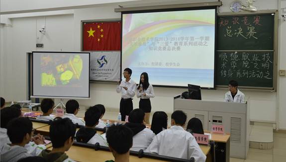 为了共同奋斗青春梦,实现中国梦,继续巩固和加强德赢多年以来开展的“文明修身”活动成果,深化“文明修身”内涵建设,提高广大同学的文明道德水平,促进校风学风建设,展现大学生文明风采,营造一个讲文明、知礼仪的文明校园氛围,让在校学生受到更好的熏陶,成为“爱学习、爱劳动、爱祖国”(简称“三爱”教育)的文明学生,12月24日晚上,校学生会在教学楼8-300举行了以“三爱同行 共筑梦想”为主题的文明修身知识竞赛。校团委相关负责人、老师和各二级学院学生会指导老师及近300名观众参加了该活动,共有来自各学院的10支代表队参加了本次知识竞赛。
