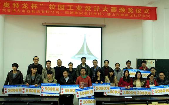 2013年12月末,又一轮工业设计专业“校企合作、项目载体”课程设计竞赛落下帷幕,这是设计学院工业设计专业第16次举办这样的课程设计活动。由广东奥特龙电器制造有限公司支持和资助,佛山顺德社区学院、顺职设计学院工业设计专业承办的“奥特龙杯”校园工业设计大赛,27日下午在设计学院阶梯教室举行了颁奖仪式,广东奥特龙公司领导和佛山顺德社区学院的领导为获奖同学颁发了奖状和奖金。