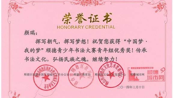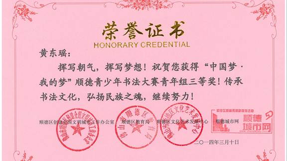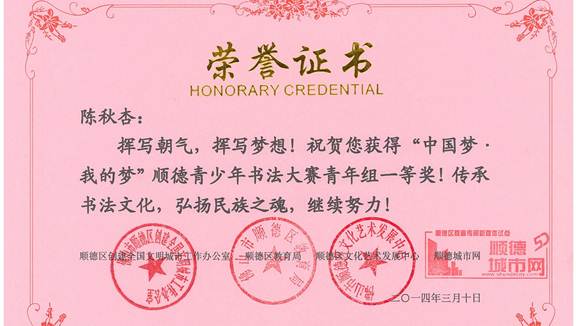由顺德区委宣传部、区创建办、区教育局、区文化艺术发展中心、顺德城市网联合主办,区书法家协会协办的“中国梦·我的梦”顺德青少年书法作品征集大赛结果揭晓,由德赢周昊老师指导的陈秋杏、陈景实、黄东瑶、颜瑞等同学的书法作品,分获一、二、三等奖和优秀奖,并获得奖金和荣誉证书。酒店与旅游管理学院陈秋杏同学获得青年组唯一的一等奖。