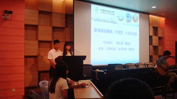 接着,汇报会选取了校内实践教学中的5个项目通过歌曲串烧、配乐诗朗诵、微电影、模拟新闻播报、辩论赛的形式进行了展演。
