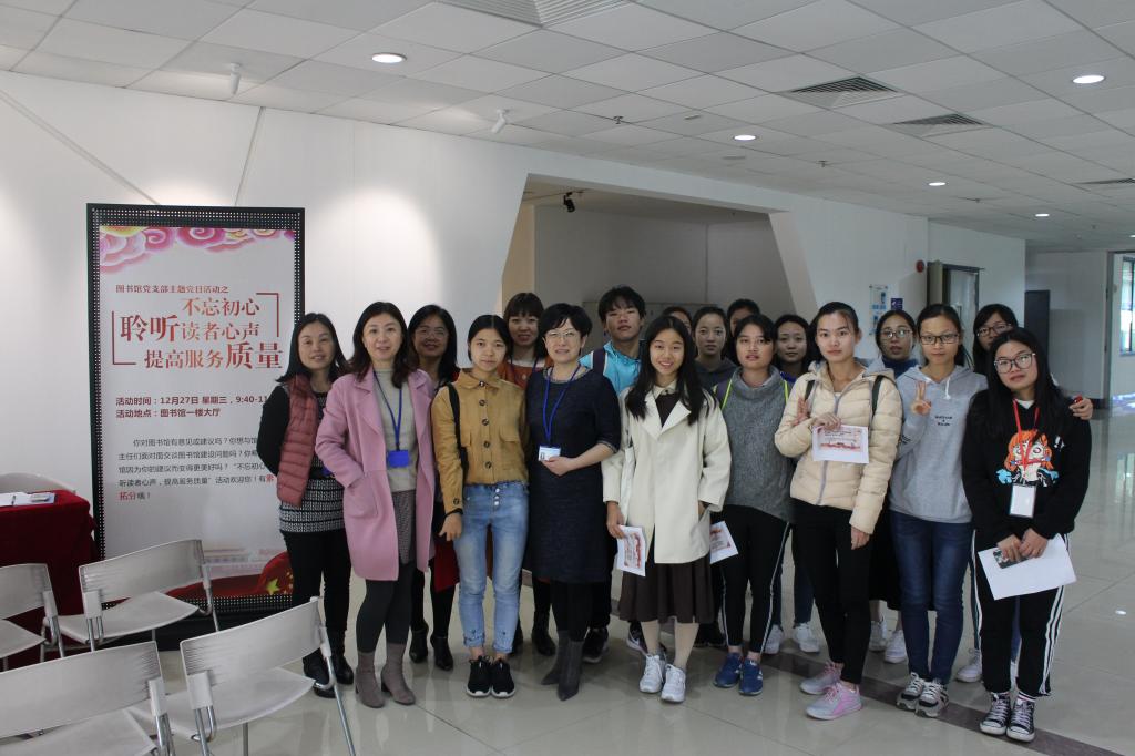 2017年12月27日上午,图书馆党支部在图书馆一楼大厅开展了“不忘初心,聆听读者心声,提高服务质量”主题党日活动。图书馆党支部书记张彦静和支部委员以及部分党员代表参加了本次活动。活动吸引了来自各院系的49位同学参加。亲切而愉快的面对面的交流方式,立刻吸引了大量的同学积极参与。同学们与图书馆的工作人员畅所欲言,很多同学都希望图书馆能提供安静的学习环境,希望能方便、快捷的找到心仪的图书,希望图书馆多举办读书活动等等。