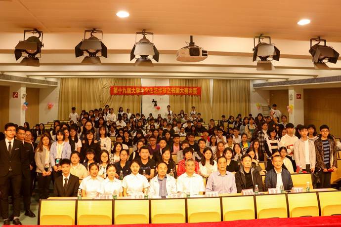 本次大赛以“歌颂祖国七十华诞,演绎青春二十芳华”为主题,通过全校性初赛严格筛选,软笔组、硬笔组、绘画组共30份作品进入决赛,决赛由选手作品展示与汇报,评委即兴提问,和评分颁奖三个环节组成。