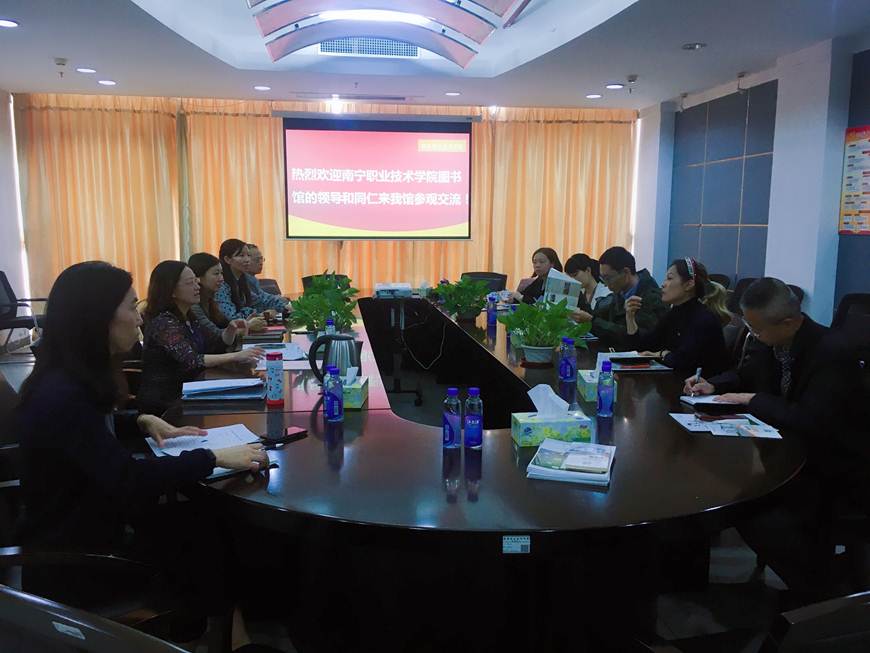 黄慧介绍了南宁职业技术学院图书馆的基本情况。随后双方就图书馆的建设理念、定题服务、专利分析、如何为学校重点专业提供优质服务等方面的问题进行了交流。会后参观了图书馆艺术共享空间。