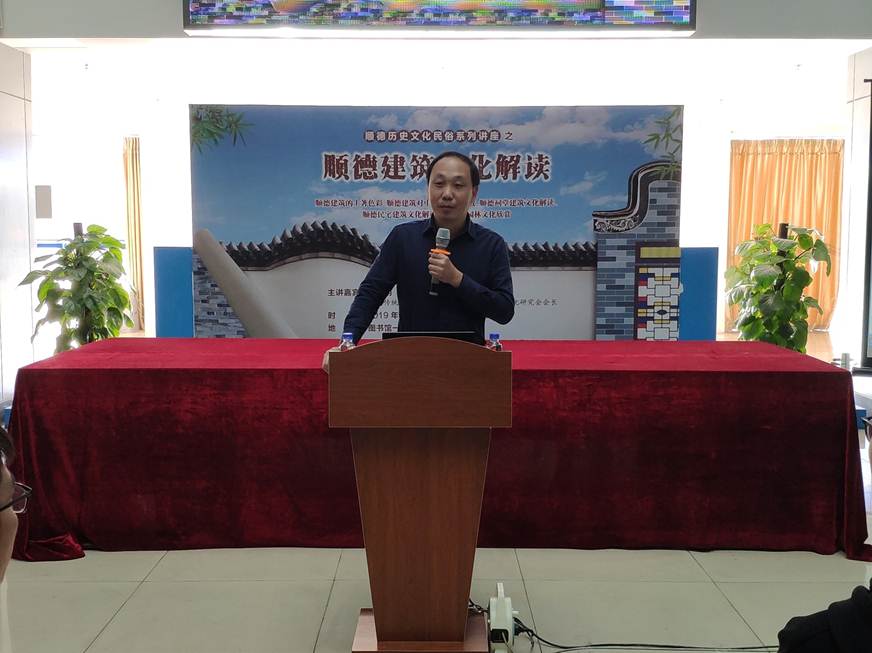 李建明老师先后从顺德建筑的土著色彩及对中原文化的吸收、顺德祠堂建筑文化解读、顺德民宅建筑文化解读、清晖园园林文化欣赏五部分内容把流传几百年的顺德建筑文化、民俗习惯诠释得惟妙惟肖、引人入胜。他用一幅东汉年间古老的房子图片引出顺德土著建筑的特点——原始、依水而居。结合蚝壳等建筑的用料,他深刻剖析了顺德建筑的细部结构,不同时代的历史变迁,并由此引出很多有趣的名人轶事以及地方文化韵味。接着李建明老师用大量的实地考察图片将顺德祠堂的历史、规矩、社会功能、文化功能向在场的读者娓娓道来。他指出宗祠的大门、柱子、石雕、瓦顶、摆件等建筑细部与历史、规矩、习俗有着千丝万缕的联系。深层次的宗祠文化内涵阐述,让年轻一代直观、深入地认识到血脉传承的载体和痕迹,认识到乡村文明的根源。接着讲述了顺德民宅的空间结构,天井、趟栊门展现的天人合一、人际关系的玄妙。最后,李老师从建筑座向、园林结构、庭院风格功用等方面带领读者欣赏了清晖园园林文化。让读者从园林美景中一览中西文化合璧之精妙。