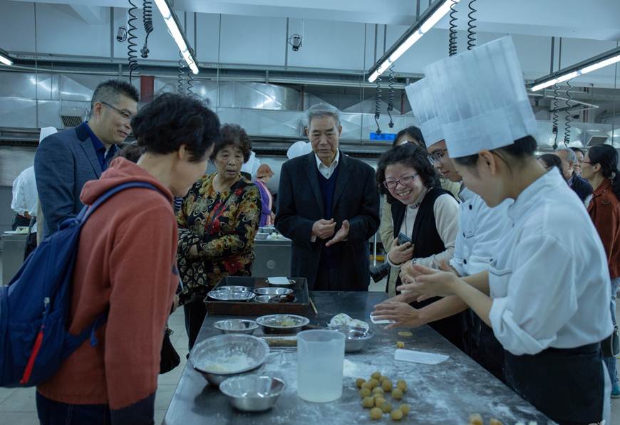 会后,在工作人员的陪同下,退休老教师分别参观了烹饪学院学生实训中心、智慧校园节能减排中心、设计学院毕业设计展、校训石广场和校园校园等。参观烹饪学院实训楼时,前辈们对现场实习环境表现出浓厚的兴趣并对正在专心进行烹饪学习的同学们表达出高度的赞赏,鼓励他们认真学习,珍惜当下;在节能减排中心,前辈们对通过网络平台监控全校每一栋建筑用水用电量,并精准化计算与控制节能减排,完善校园能源管理体系,纷纷感叹学校智慧发展水平之高;对于设计学院学生的毕业设计,每一件优秀的作品前辈们都仔细观赏,忍不住亲身试用,互相讨论着作品的设计理念和特色,跟讲解老师了解现在社会的潮流趋向等。参观期间,前辈们对学校校容校貌、教学环境、校园文化建设、学生技能培养及取得的巨大成就赞不绝口,为今天学校的长足发展感到由衷的骄傲和自豪,希望学校能够继续高质量发展,不断谱写高职教育事业新篇章,争当高职教育领跑者。