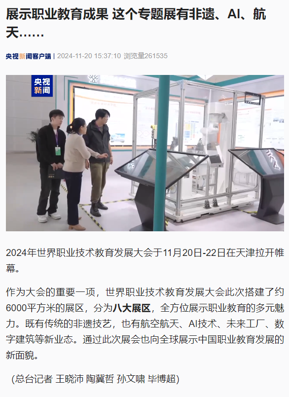 大会同期设置职业教育专题展。专题展由2024年世界职业技术教育发展大会组委会主办,牵头单位是中国职业技术教育学会。专题展搭建约6000平方米的展区,分为“技能塑造人生”“技艺传承文明”“服务产业升级 服务区域发展”“国际交流合作”“产教互融互通”“创新赋能未来”等板块,展示职业教育在服务经济社会发展、服务国家重大战略、服务人的全面发展等方面的突出贡献。